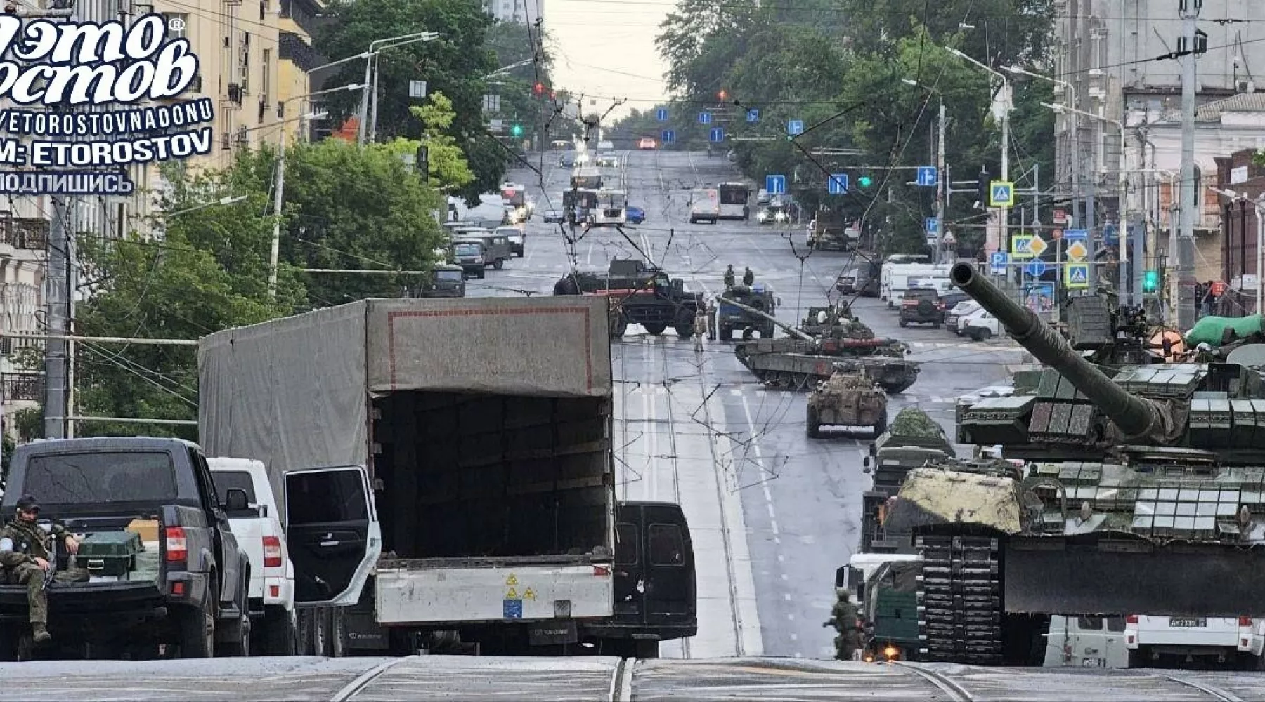 В центре Ростова-на-Дону колонны боевой техники и люди в камуфляже. Телеграм-канал 161.ru передает, что в Ростове заблокированы целые кварталы. Люди в форме оцепили не только военный штаб, но и отдел полиции, главк МВД, УФСБ и администрацию города.