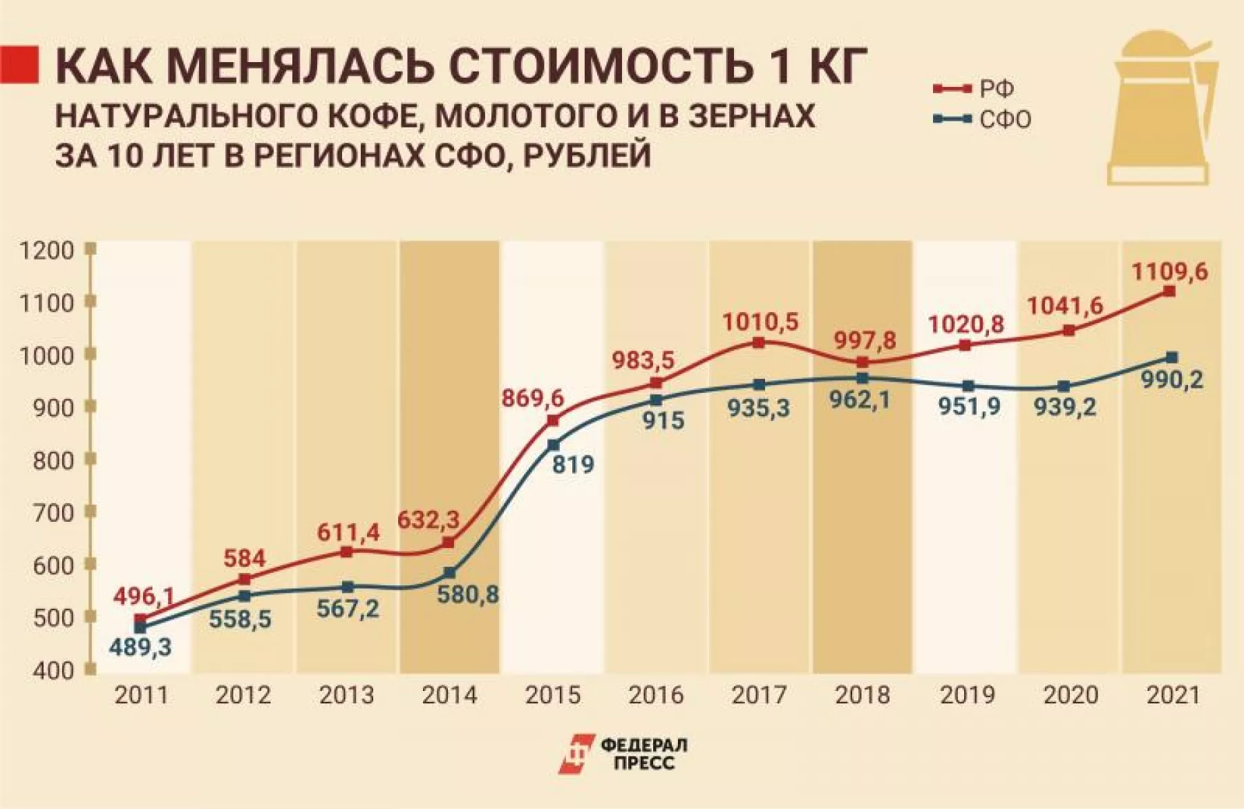 Алтайский край расположился примерно посередине рейтинга. В нашем регионе за килограмм натурального кофе придется заплатить 988,5 рублей. При этом именно в Алтайском крае за минувший год кофе подорожал больше всего - сразу на 11 %.