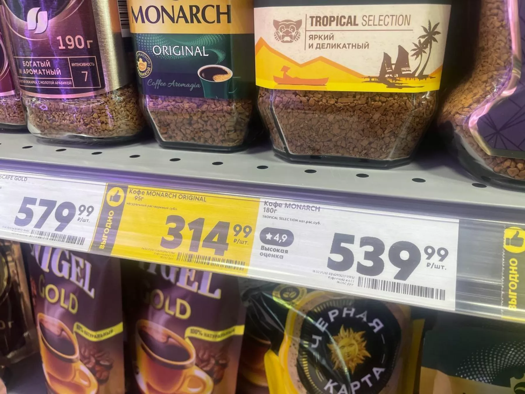 На известных маркетплейсах цена значительно отличается. Некоторые продавцы предлагают купить 190 г кофе в стеклянной банке за 560 рублей, а другие ставят цену в 1 тыс. рублей.