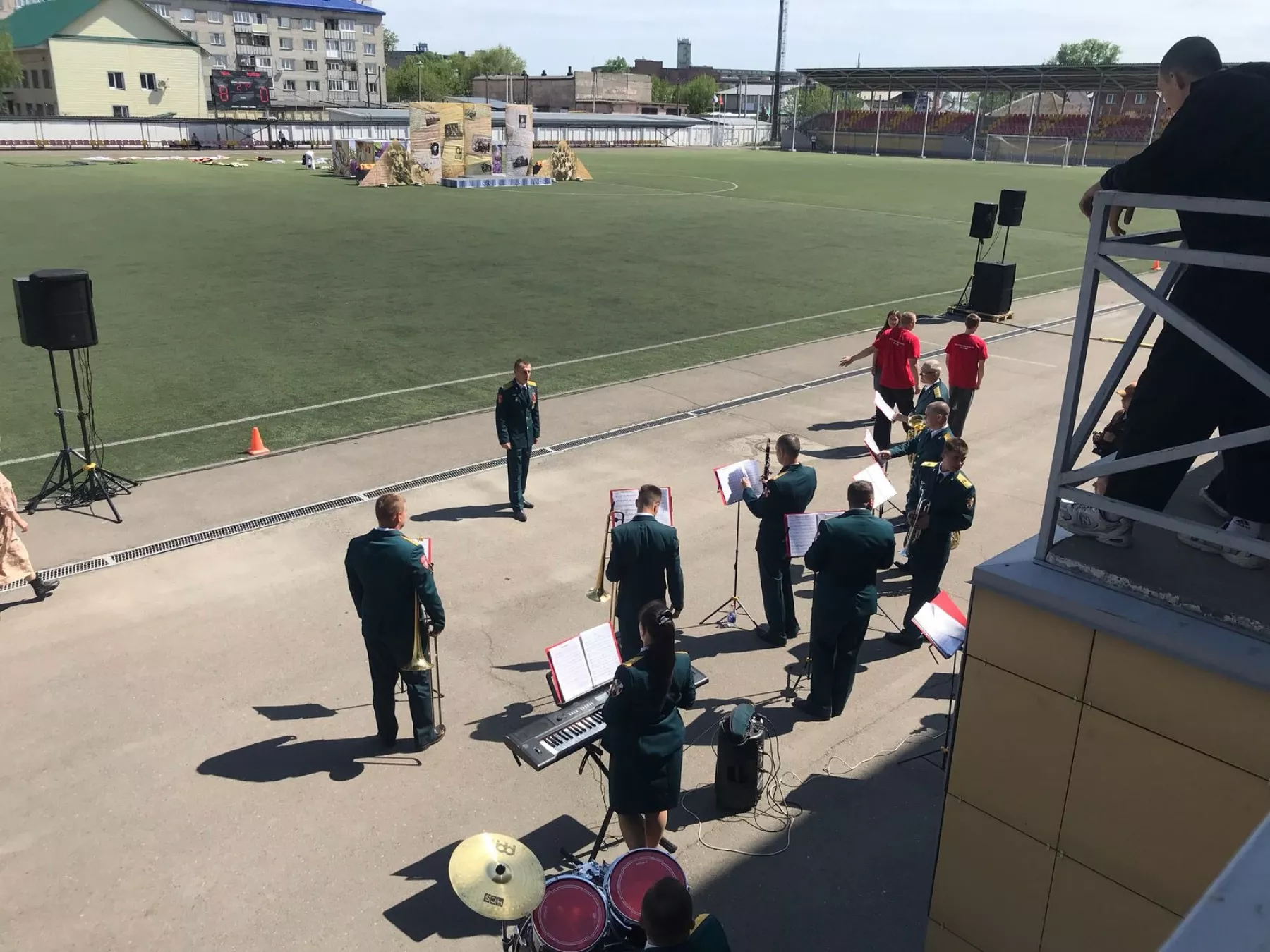 Настроение зрителям задает оркестр, репертуар которого сегодня - исключительно патриотический. Радует прекрасная организация процесса: волонтеры помогают зрителям, указывая дорогу до трибун.