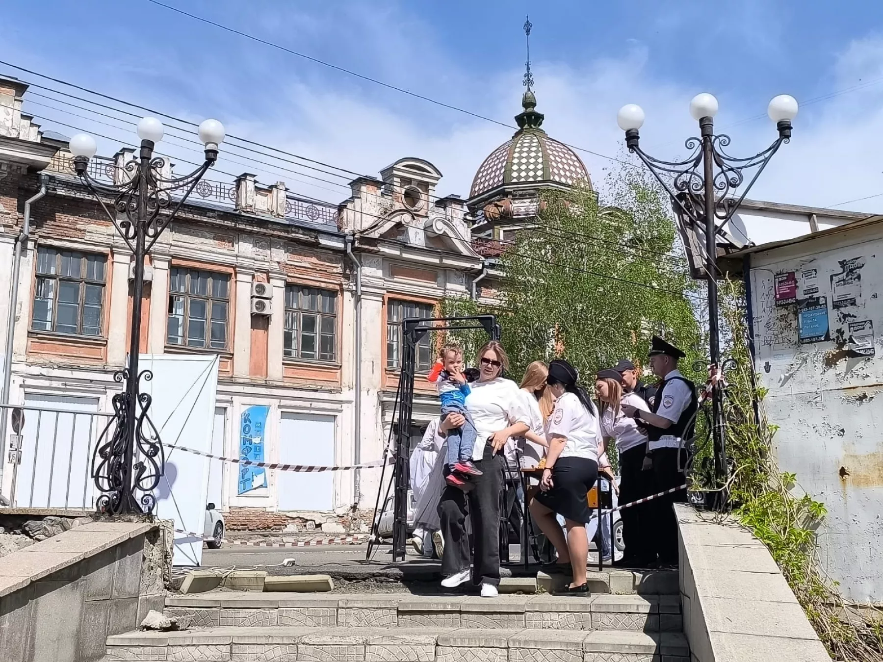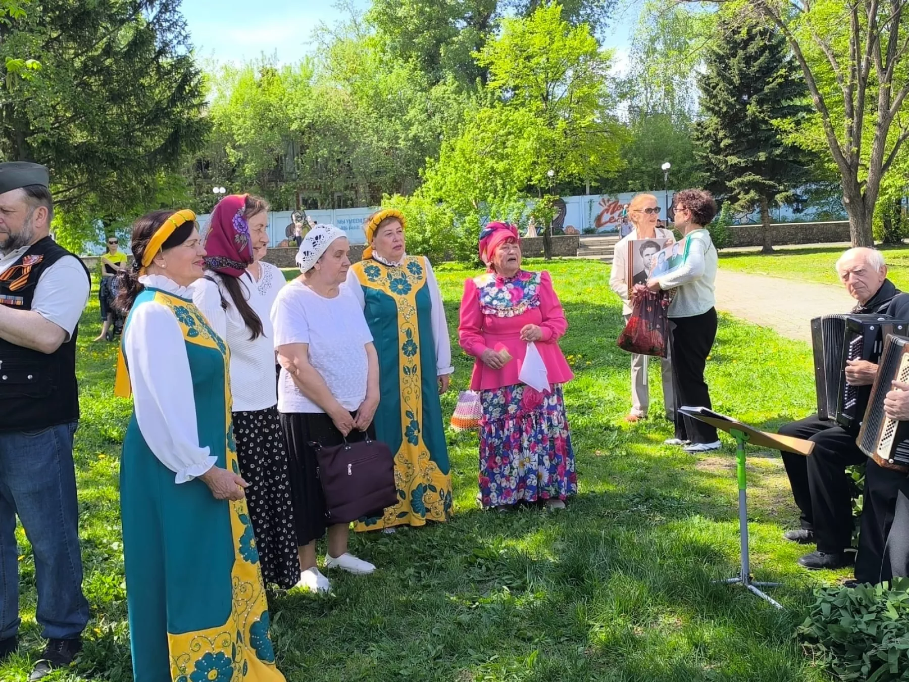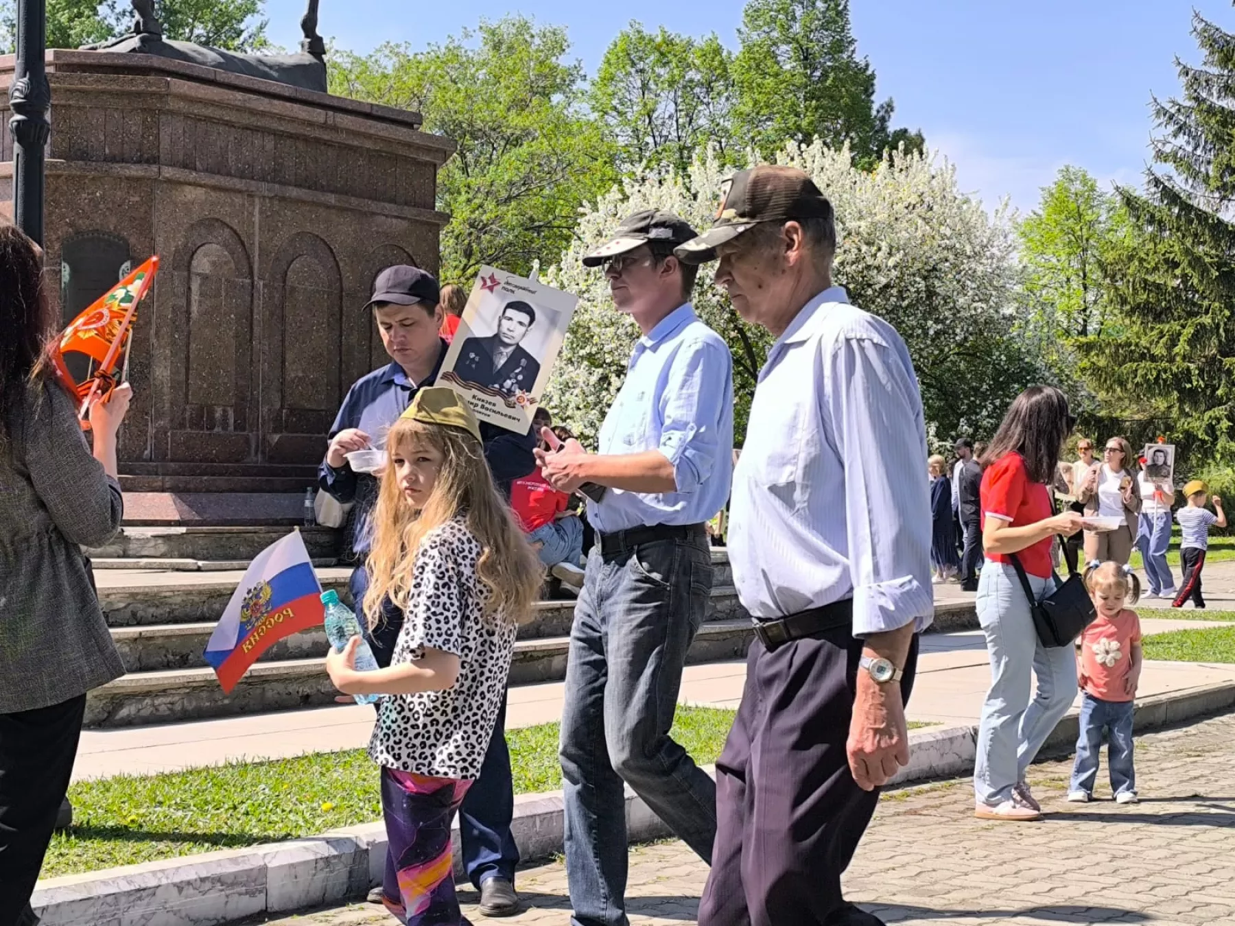 Люди пошли на праздник не только с портретами воевавших родственников. Многие несут копии красного Знамени Победы.