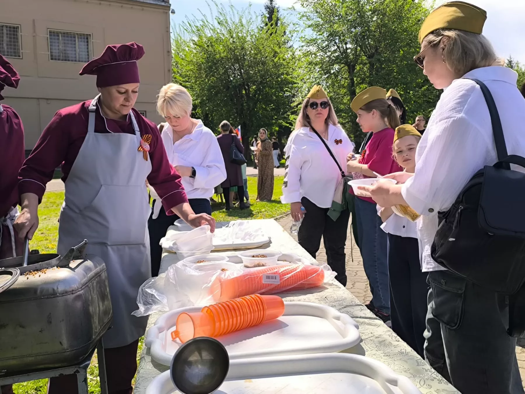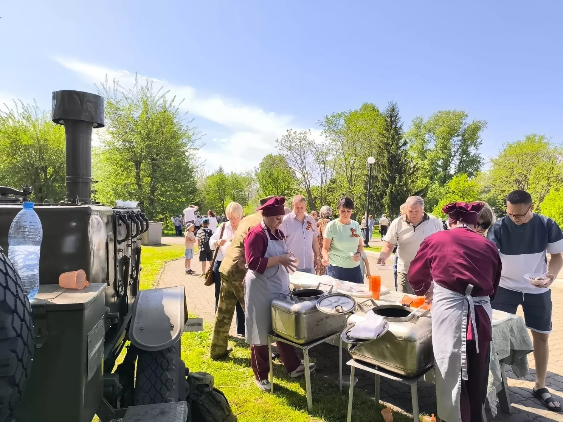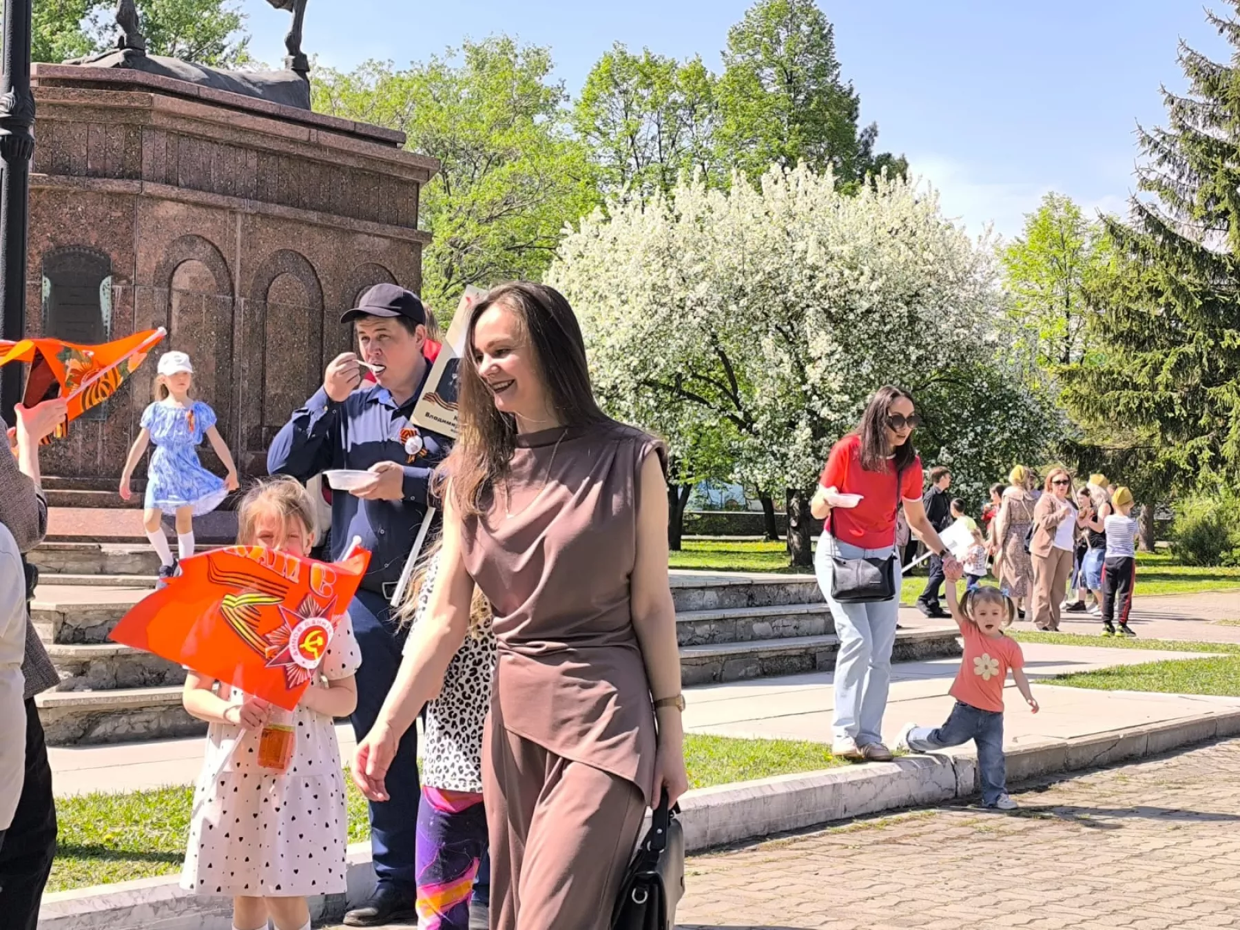 Еще перед началом шествия многие решили подкрепиться. В парке организована полевая кухня. Бийчан угощают горячей гречкой и чаем, а те в ответ благодарят и хвалят вкусную кашу.