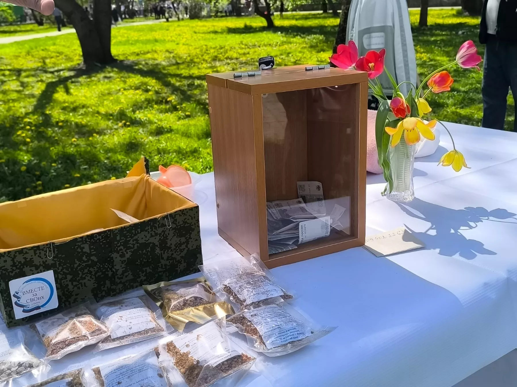 Здесь же волонтеры фонда "Вместе за СВОих" предлагают поплести сети, открыт сбор средств для бойцов.