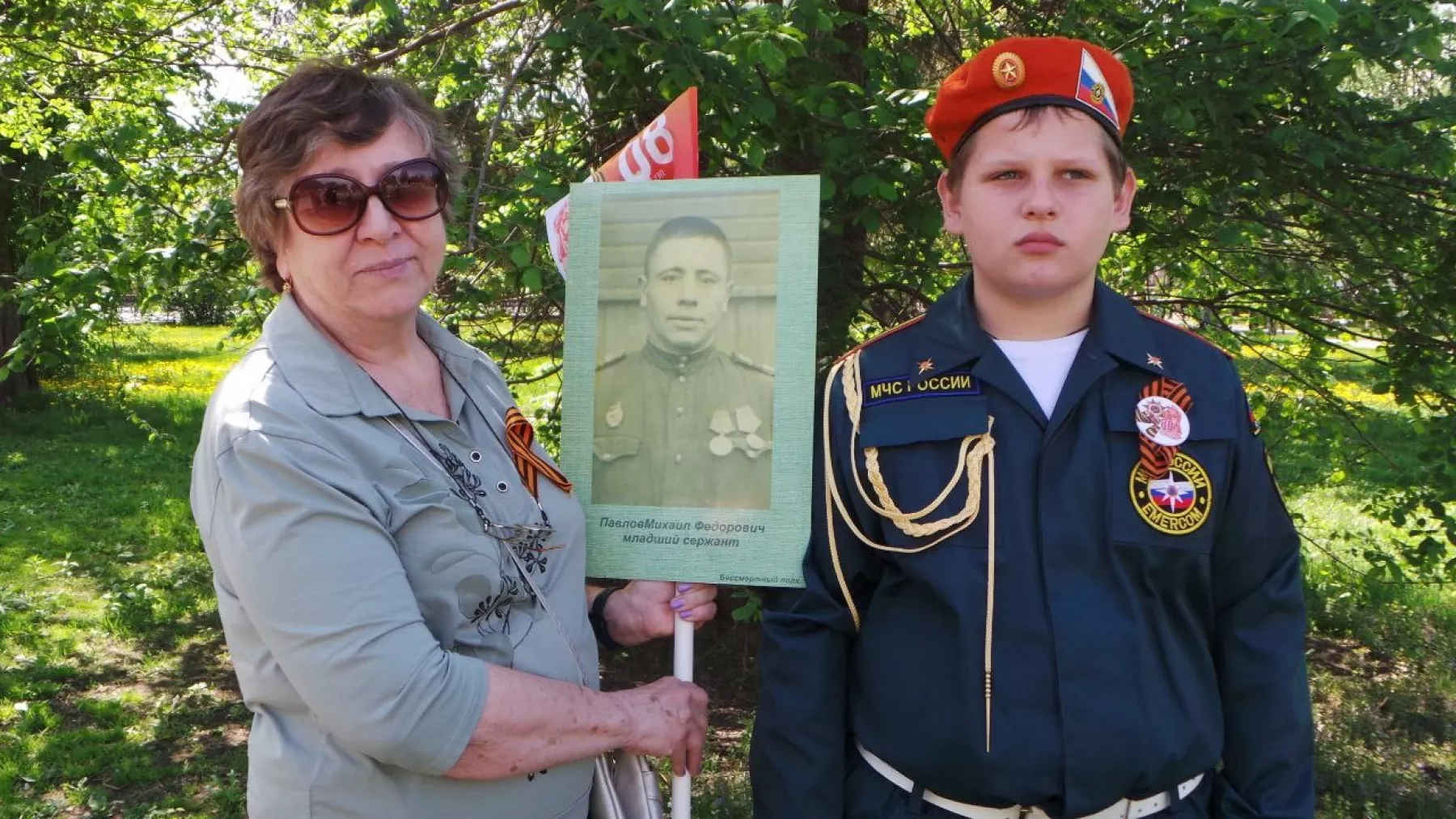 Надежда Логинова и ее внук пришли на шествие с портретом Михаила Федоровича Павлова.