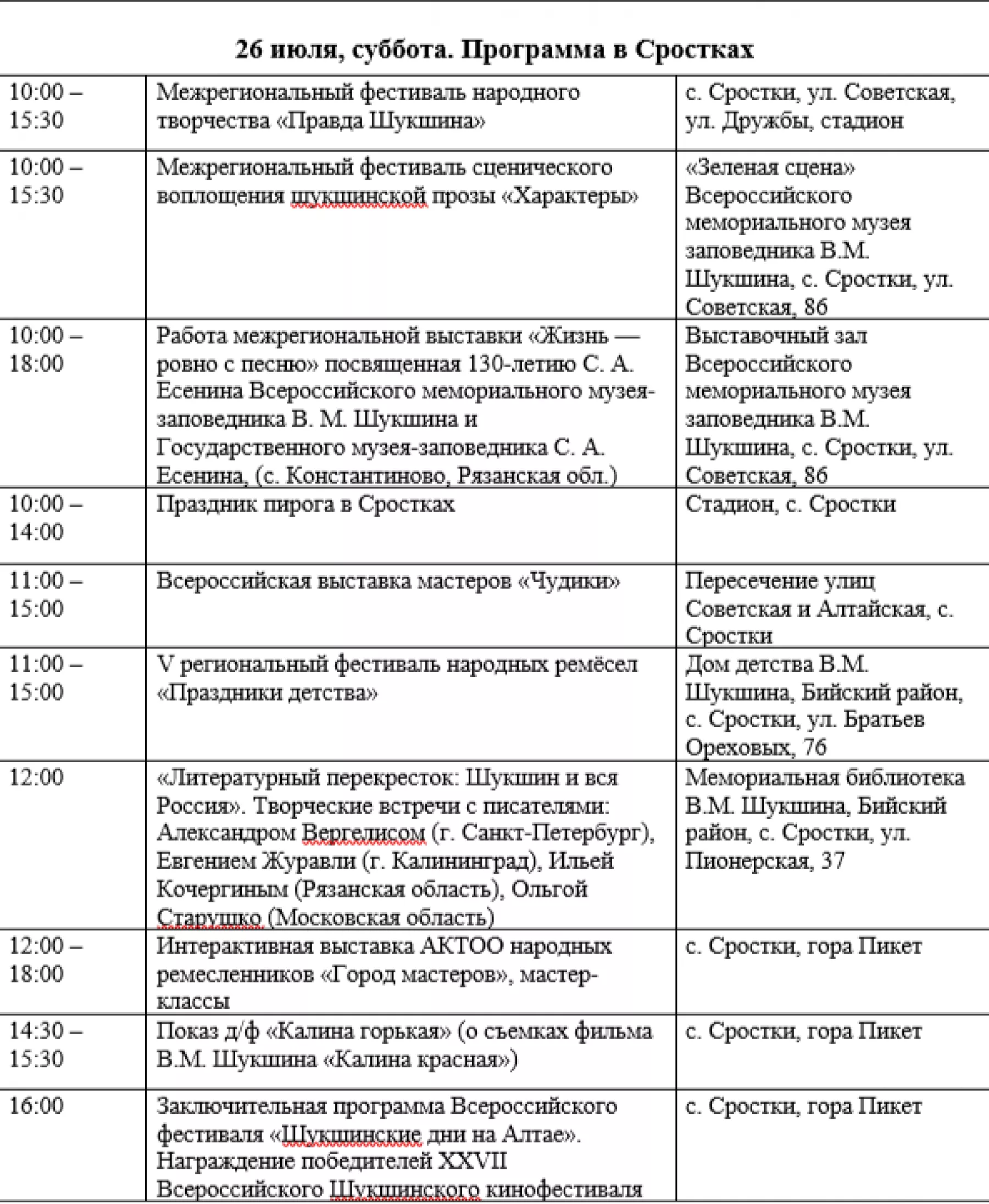 Программа «Шукшинских дней на Алтае – 2025» на 26 июля