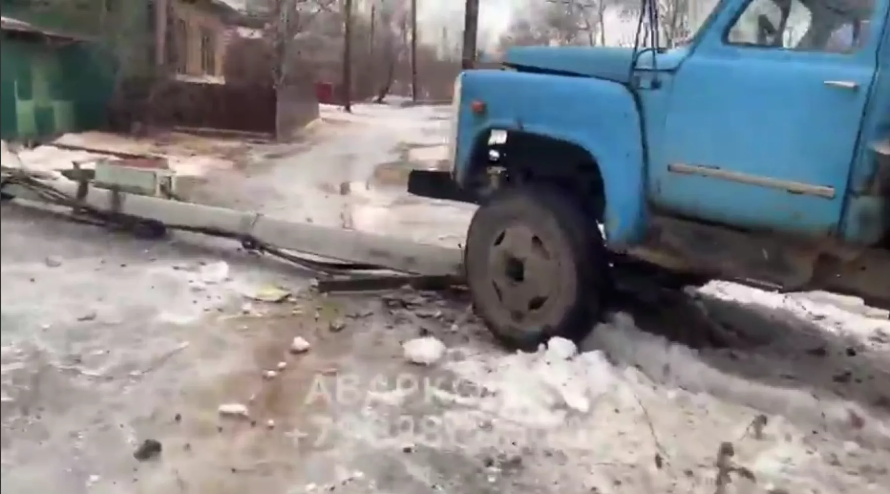 Водитель груженого досками автомобиля потерял управление и свернул с дороги врезавшись в бетонный столб. Совсем рядом располагался частный дом, столб упал прямо перед его воротами, а провода оказались во дворе.