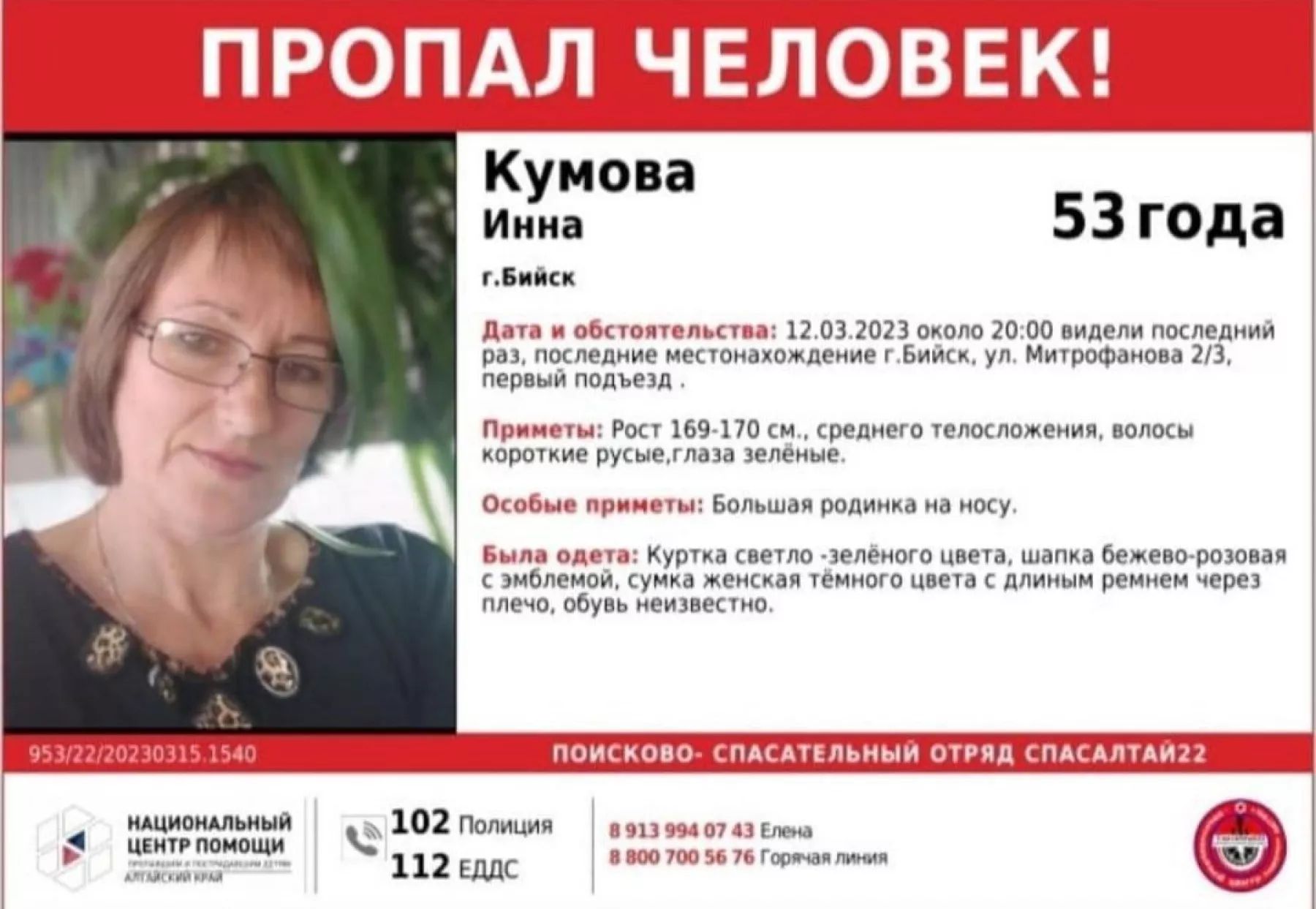 В Бийске волонтеры разыскивают Инну Кумову, ей 53 года, сообщает поисково-спасательный отряд «Спас-Алтай 22». Известно, что последний раз ее видели 12 марта около восьми часов вечера. Последнее местонахождение Инны Кумовой – улица Митрофанова, 2/3, первый подъезд. Известно, что до настоящего времени женщина не объявлялась.