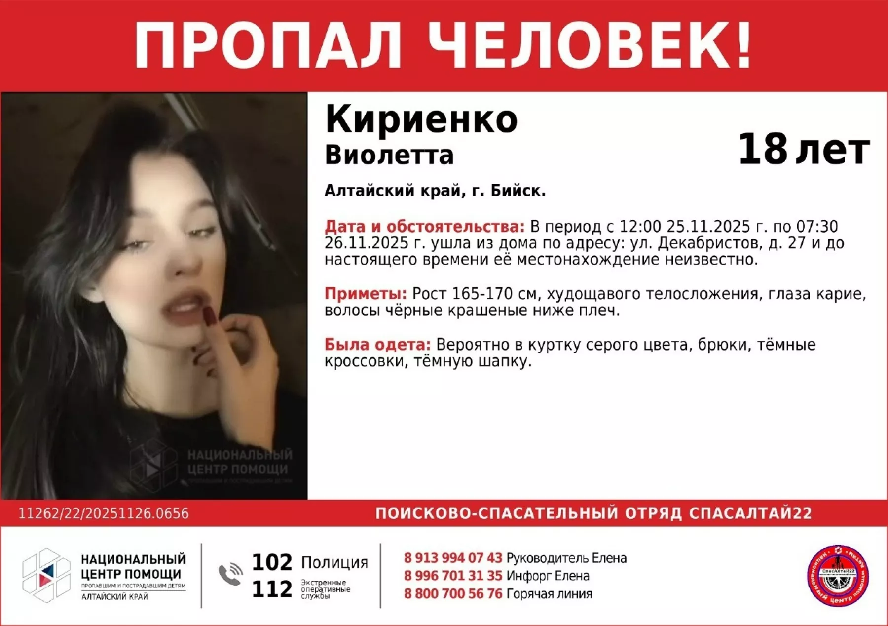 В период с 12:00 25 ноября по 7:30 26 ноября пропавшая ушла из дома по адресу: Декабристов, 27, и до настоящего времени ее местонахождение неизвестно.