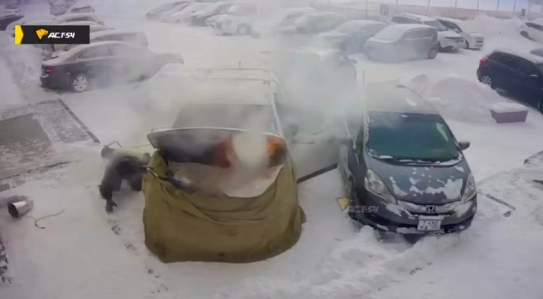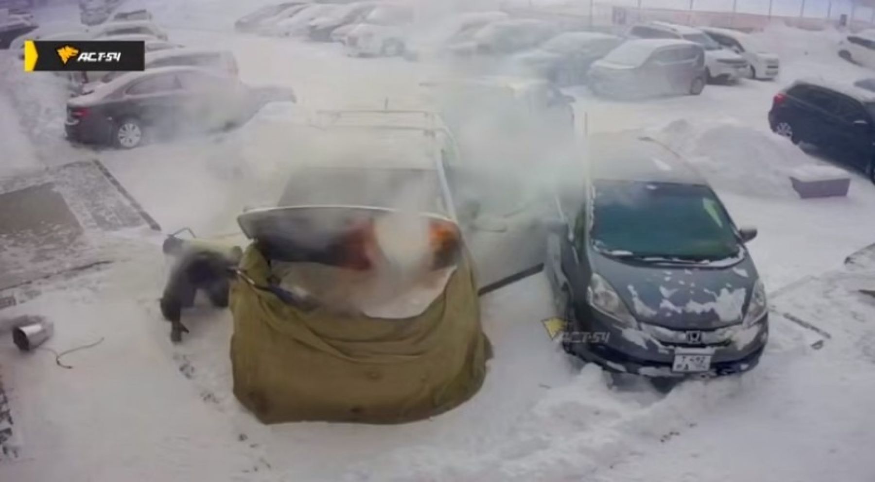 Было видно, что машину полностью укрыли специальными одеялами, а под низ была направлена тепловая пушка. В какой-то момент из-под капота повалил дым, а после — открытый огонь. Несмотря на усилия мужчин, которые находились рядом, остановить возгорание не удалось. Припаркованное рядом соседнее авто удалось отогнать, а вот пострадавший автомобиль в конце концов почти полностью выгорел.