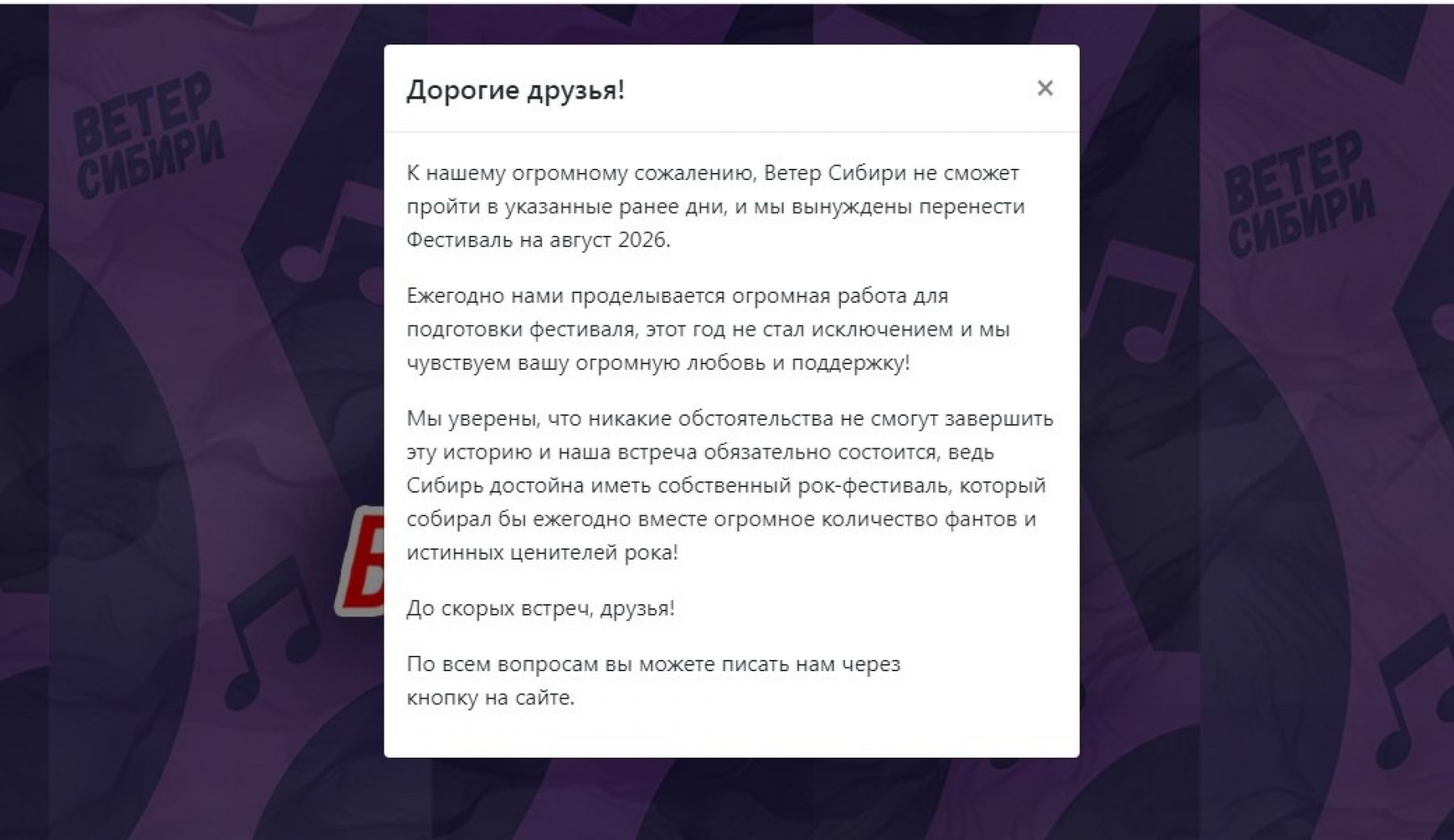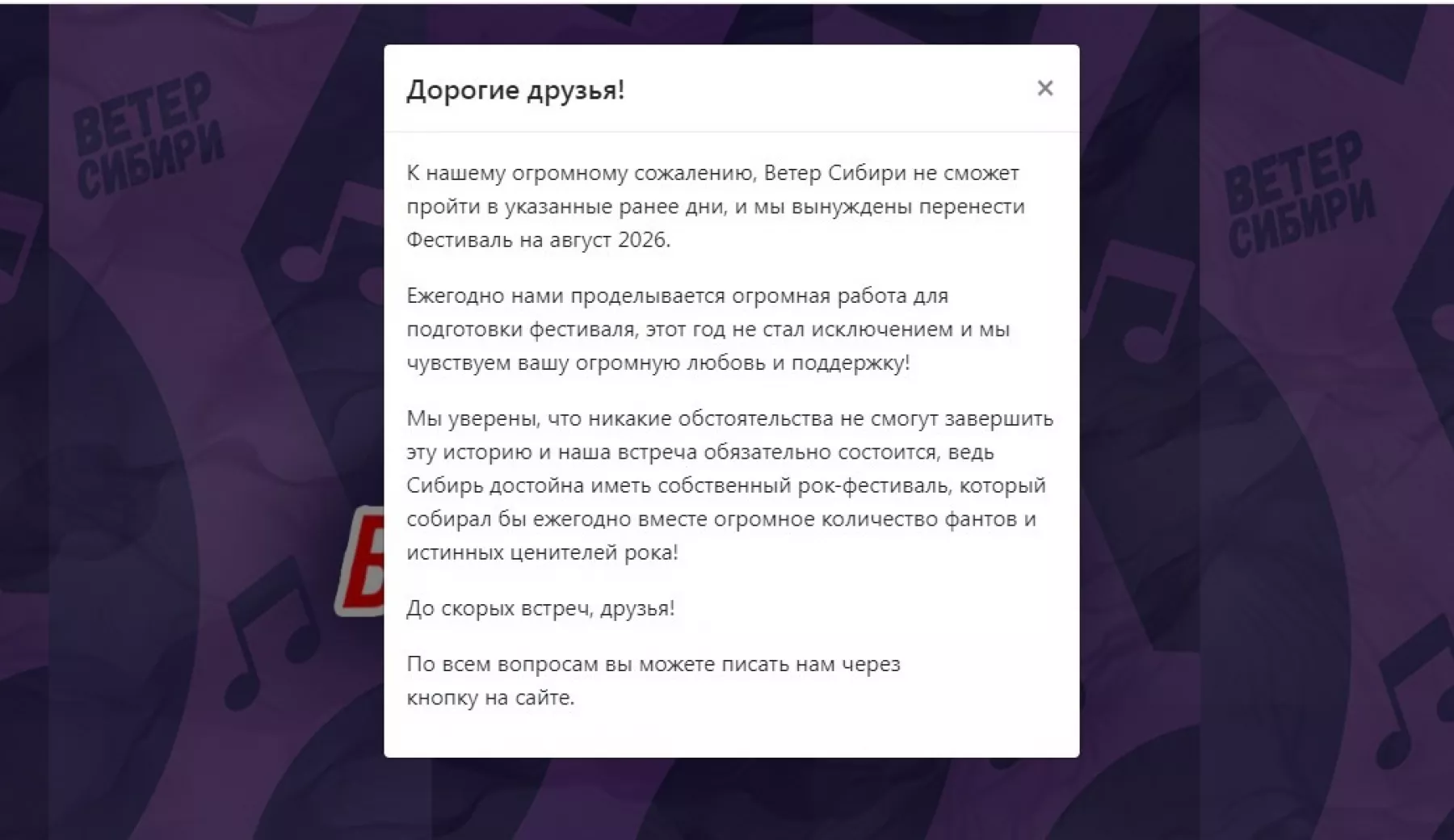 Фестиваль "Ветер Сибири" давно отменен, а с последствиями "работы" его организаторов купившие билеты сталкиваются по сей день. В группе ВКонтакте "Деньги на Ветер Сибири" делятся скринами - средства, потраченные на поездку на концерт, так и не вернули. Напомним, что в 2025 году «Ветер Сибири» был отменен (как случалось не раз) и перенесен на август 2026 года из-за финансовых и организационных проблем, включая блокировку счетов юрлица фестиваля за налоговую задолженность. Это уже не первый случай переноса или отмены мероприятия, которое ранее планировалось провести в Бийске, но впоследствии переехало в Новосибирск.