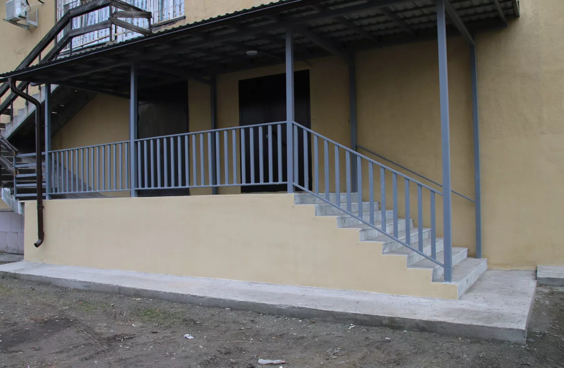 - На крыльце залили новые ступени и смонтировали металлический каркас, который объединит входы в спортзал, а в дальнейшем – бассейн.