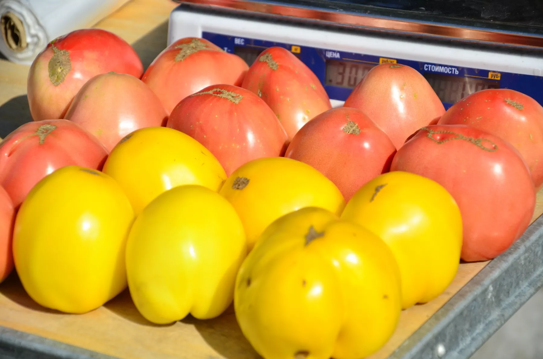 Созревают к июлю и помидоры, на рынке можно найти томаты разных сортов и выращенные в разных условиях, поэтому они очень отличаются по вкусу. Есть с кислинкой и сладкие, одни очень сочные, а другие мясистые. Некоторые равномерно красные, а некоторые с зелеными зернышками. Есть на алтайском рынке даже желтые, самые необычные по вкусу. Томаты содержат много витамина А и витамина К, а также значительное количество витаминов группы В, фолиевой кислоты и тиамина.