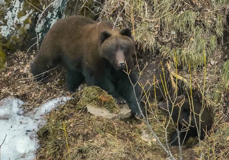 Сотрудники заповедника Роман Воробьёв и Татьяна Клименко смогли запечатлеть на фото недавно проснувшуюся медведицу с медвежатами.
